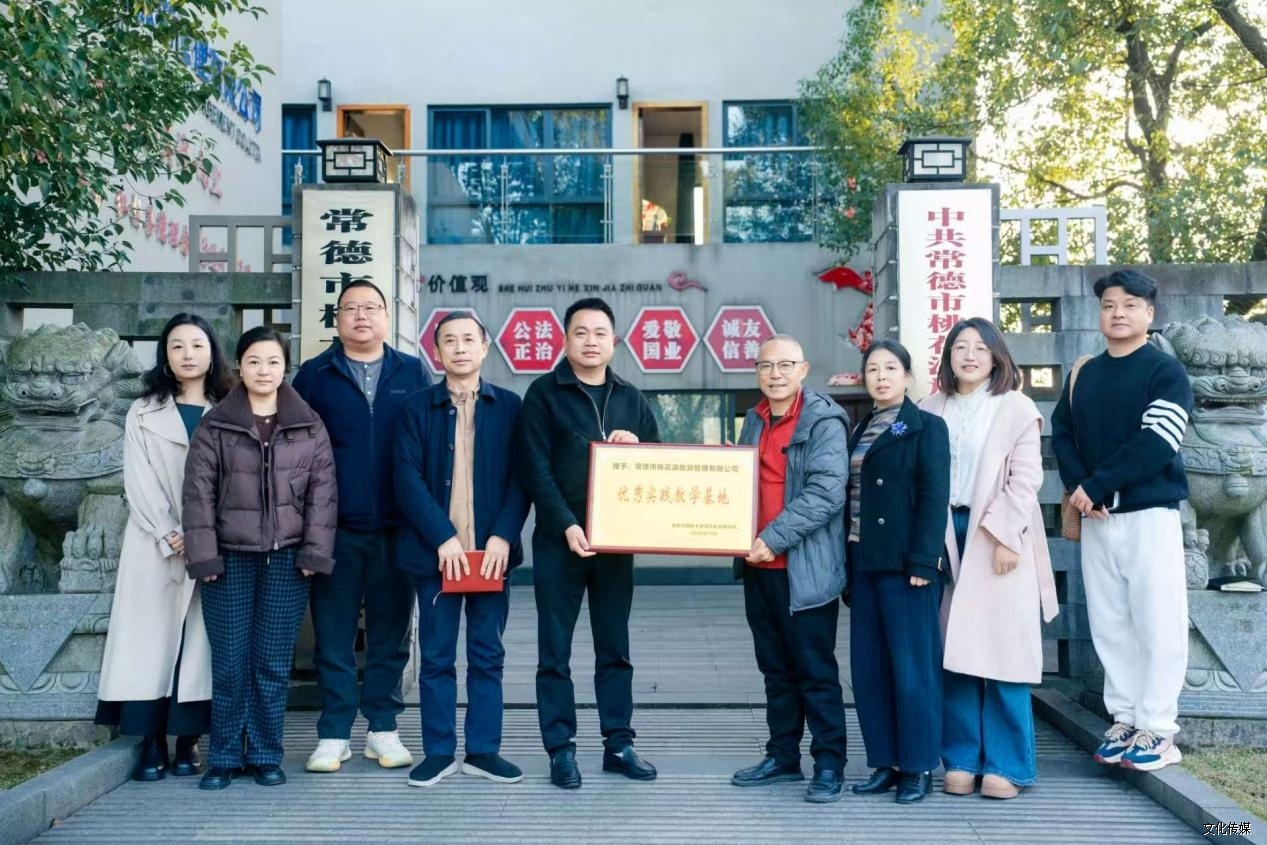 2025年11月25日下午,文化传媒学院院长江新军、副院长徐秋林、院长助理邓英及文化产业管理专业负责人尚子轩、教研室主任郭菲菲等一行,再度来到常德市桃花源旅游管理有限公司,与该公司分管市场营销的副总经理李学勇、党群人事部负责人梁姝霞等就深化产教融合、共促人才培养、搭建优质实习实践平台等方面进行了深入的交流,并举行 “优秀实践基地”授牌仪式。