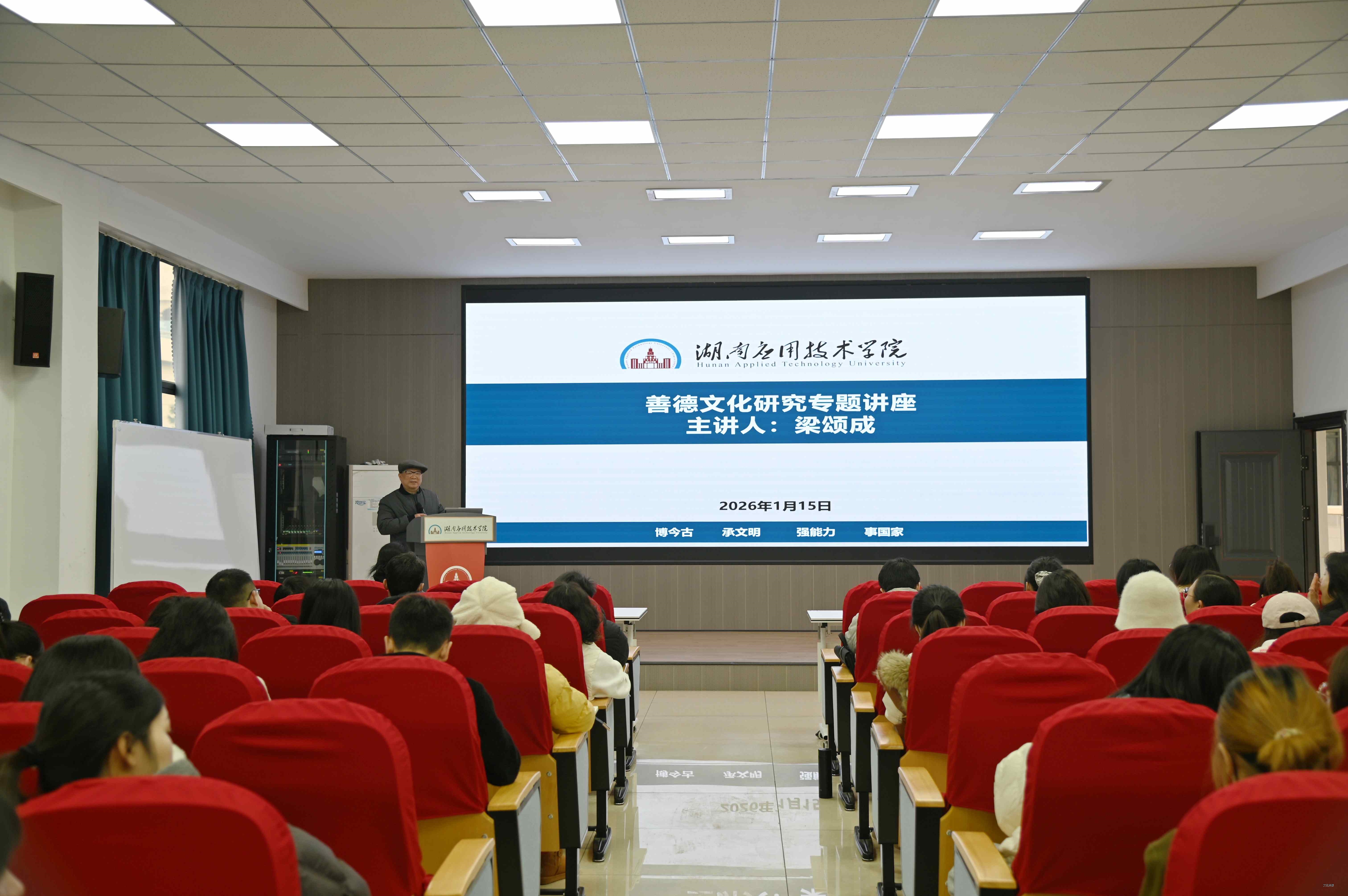 2026年1月15日上午,文化传媒学院在A3-206报告厅举办以“善德文化研究——善德教育、旅游文化资源及其利用”为专题的学术讲座,特邀常德地方文化研究专家梁颂成教授主讲。文化传媒学院、经济管理学院全体教师参加了本次活动,活动特邀学校科技处处长张平喜参加,讲座由罗兵红主持。